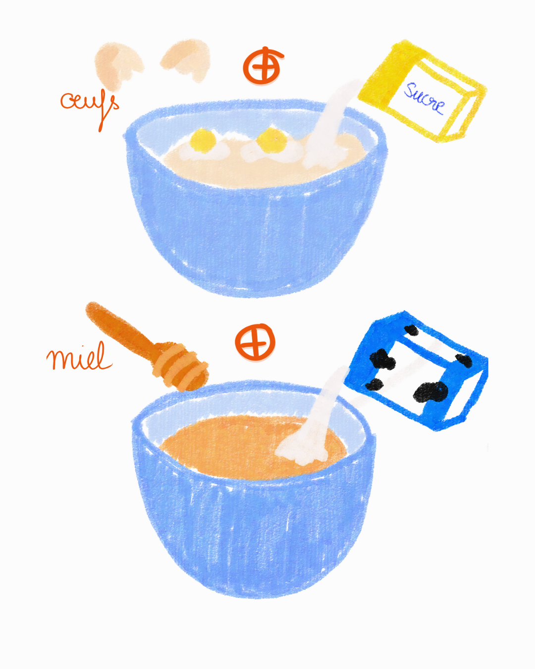 Dans un saladier, tu mélanges les oeufs et le sucre.